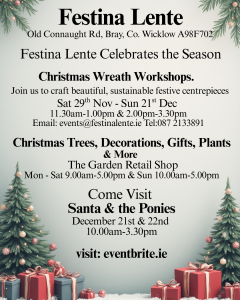 Festive Season 2025 is well underway in Festina Lente. We have a variety of events available onsite including wreath making, sustainable crafting for festive table centrepieces and swag, as well as evening crafting events via candlelight, and family events that are nature based with booking available via Festina Lente CLG Events – 13 Upcoming Activities and Tickets | Eventbrite.